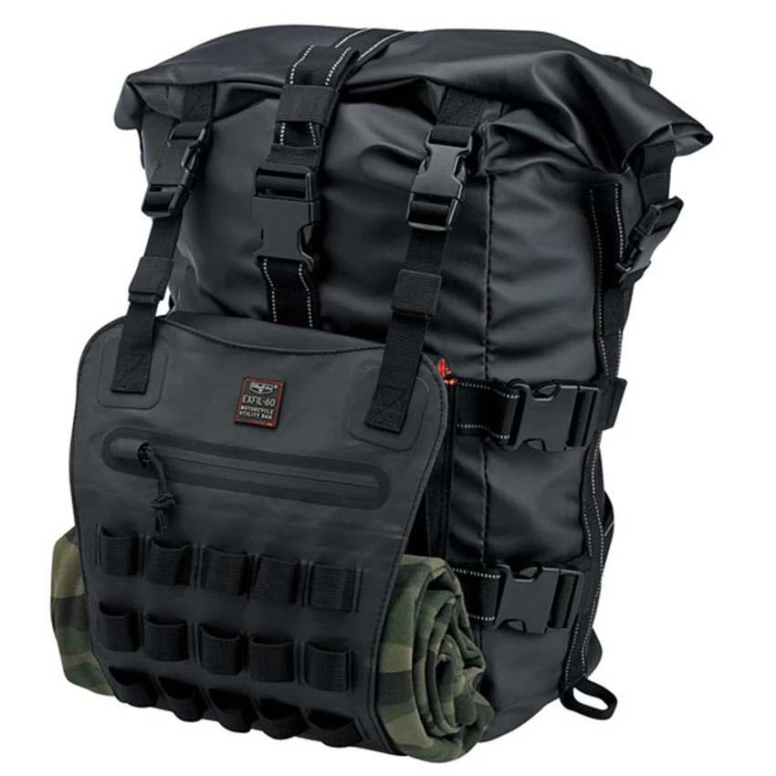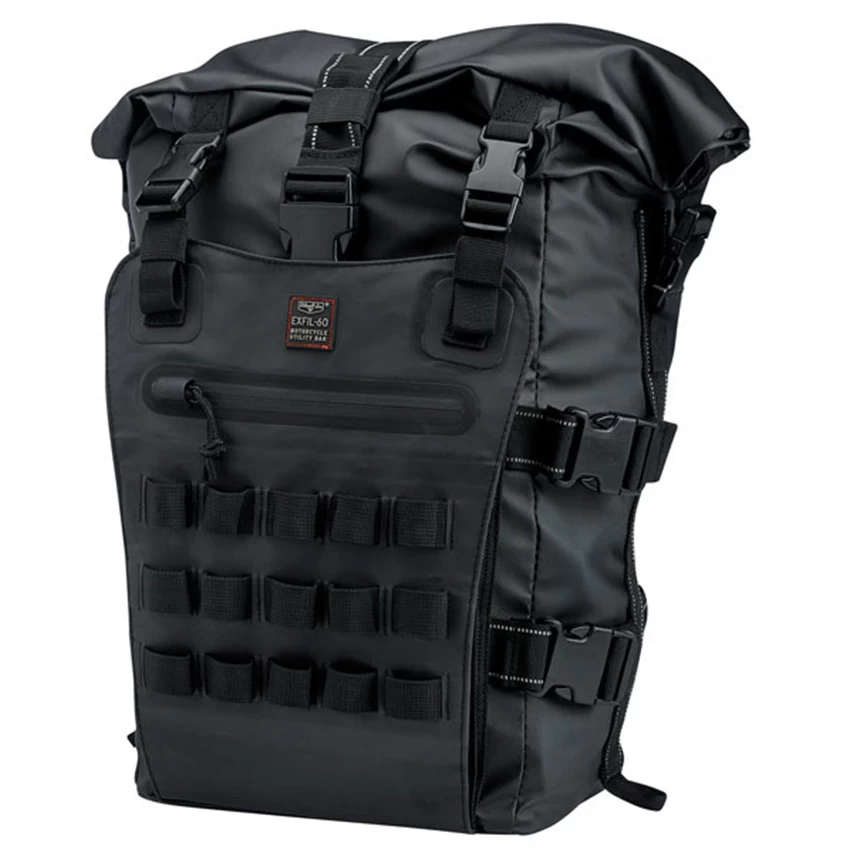 The EXFIL-60 is a comfortable size for all bikes, smaller trips or riders who like to pack a little lighter. The tarpaulin flap on the front features three rows of MOLLE, a weather-resistant zipper pocket, and a mesh pocket on the inside. This flap is adjustable without disturbing the attachment points on the bag, so it’s perfect for stashing an outer layer, bedroll etc. Universal mounting is easy with five built-in compression straps and four additional tie-down points.