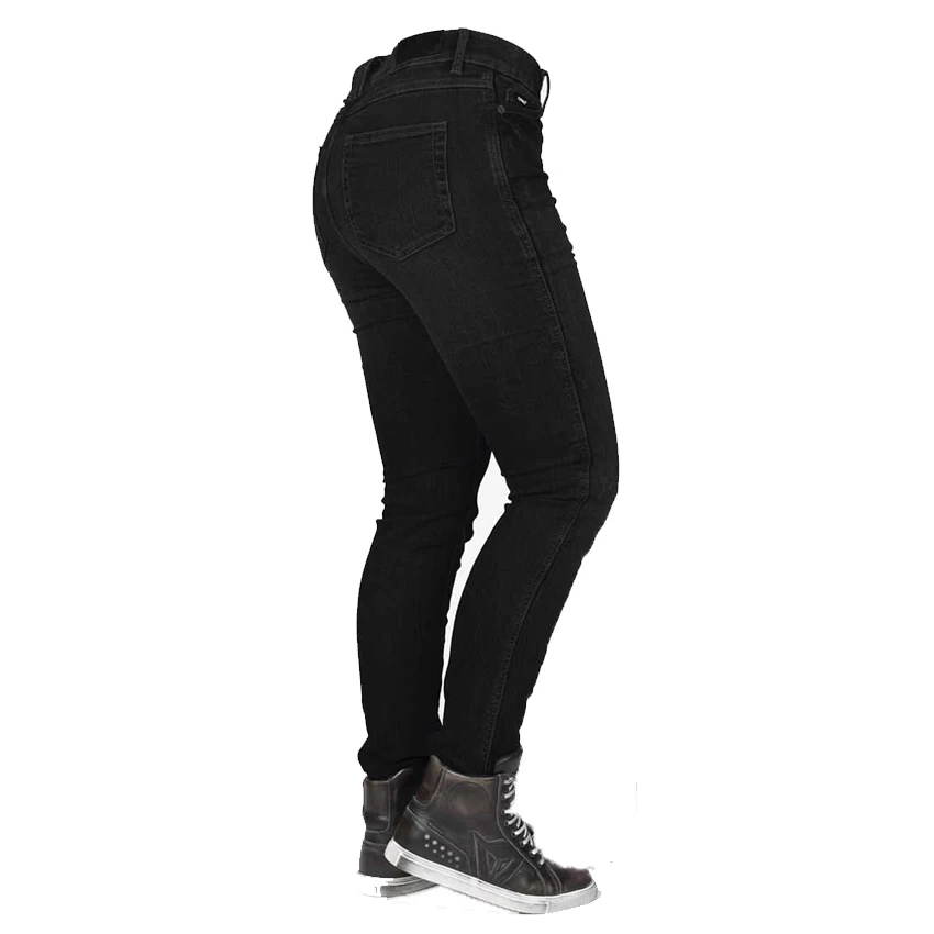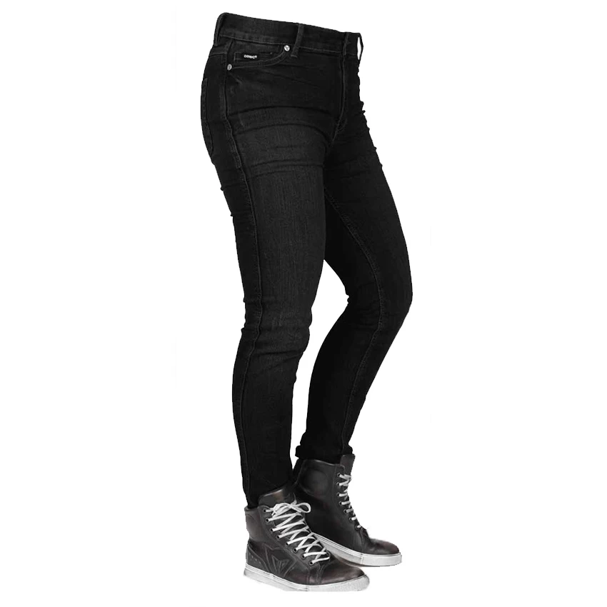 Comfortable black women’s motorcycle jeans with stretch material for improved riding comfort. Reinforced with Covec materials and equipped with protectors on the knees.