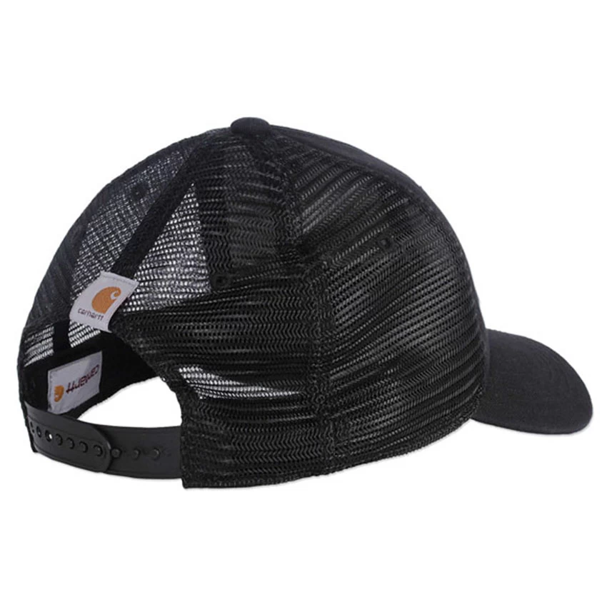 The Carhartt Dunmore canvas cap with mesh back has a pre-curved peak and adjustable snap for a perfect fit. Wicks away moisture and fights oder with an antimicrobial finish. On the front centre is the embroidered Carhartt logo. The cap is made from 100% cotton canvas with 100% polyester mesh.