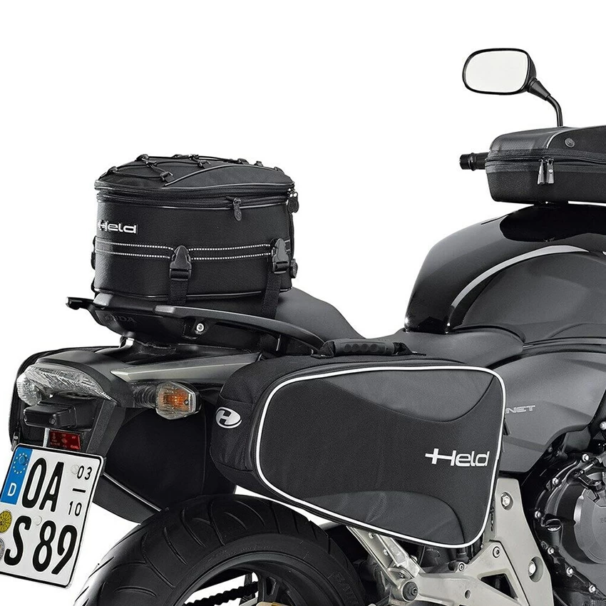 - Size L: a standard volume of 12 litres, good for a size of 36 cm x 28 cm x 18 cm. The height can be increased by a whopping 8 centimetres by means of a zipper, which immediately provides a storage space of 21 litres. An integrated helmet system disappears without any problems.