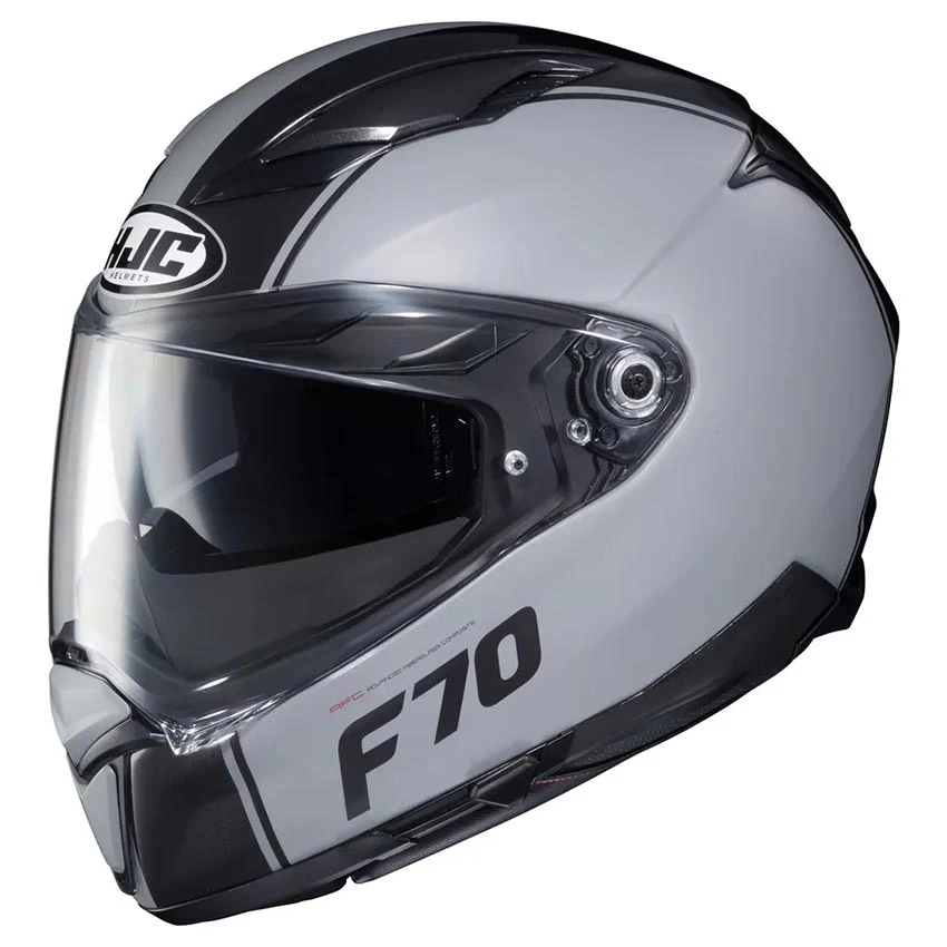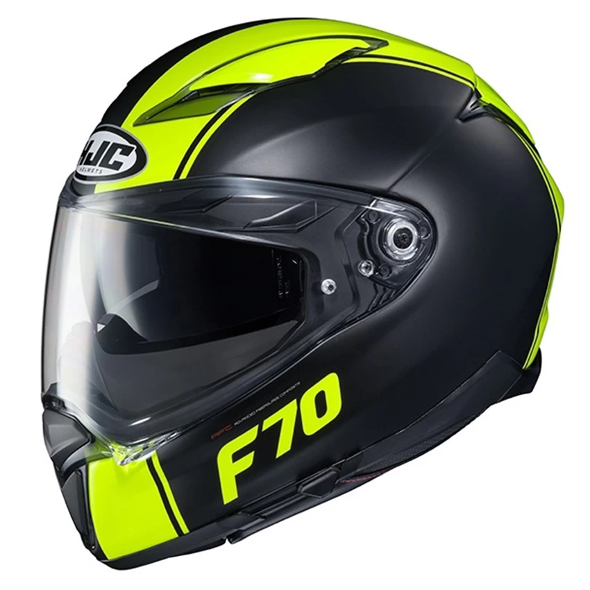 The HJC F70 Mago has an Advanced Fiberglass Composite Shell. The F70 has an HJ-32 visor, this visor is anti-scratch and pinlock prepared and comes with an additional anti-fog lens. The integrated HJ-V9 sun visor runs across the whole width of the visor and therefore provides a wider vision. F70 has Advanced Channeling Ventilation System (ACS): Full front-to-back airflow that flushes heat and humidity up and out. The Supercool lining is removable, washable and antibacterial. The F70 motorcycle helmet is prepared for the Smart HJC Bluetooth system.