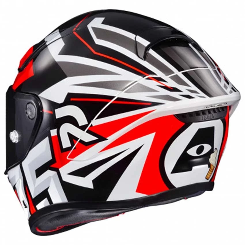 The HJC RPHA 1 Arenas Replica helmet comes with all the modern features you’d expect in a top-of-the-line full-face helmet. This racing helmet is designed and developed after several years of focused efforts and crucial feedback from top world class athletes in MotoGP. The shell is constructed of HJC’s proprietary Premium Integrated Matrix Plus material to provide enhanced Shock-Resistant performance for a more comfortable and lighter helmet. The RPHA 1 is fully certified according to the ECE 22.06 standard and FIM Racing homologated. Equipped with the Pinlock ready Clear HJ-35 visor. The anti-fog Pinlock 120 lens is included din the box. There you will also find an extra transparent racing spoiler perfect for on te circuit.
