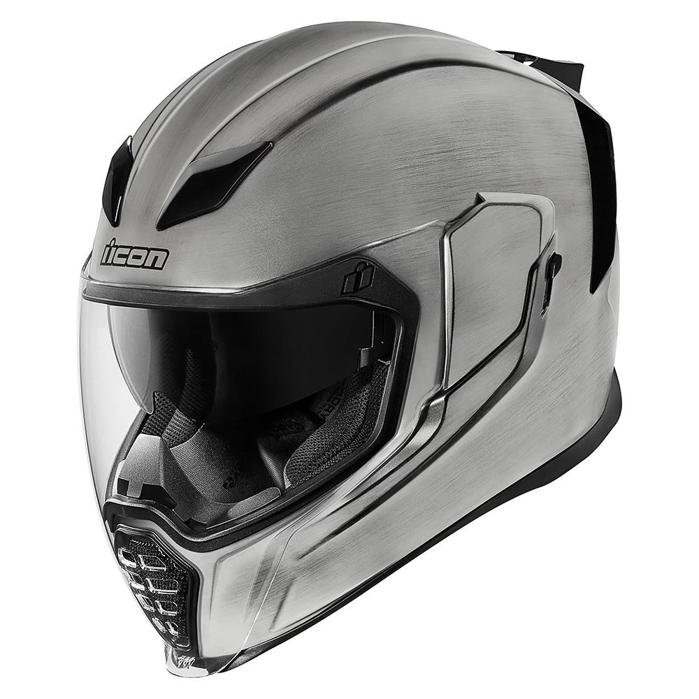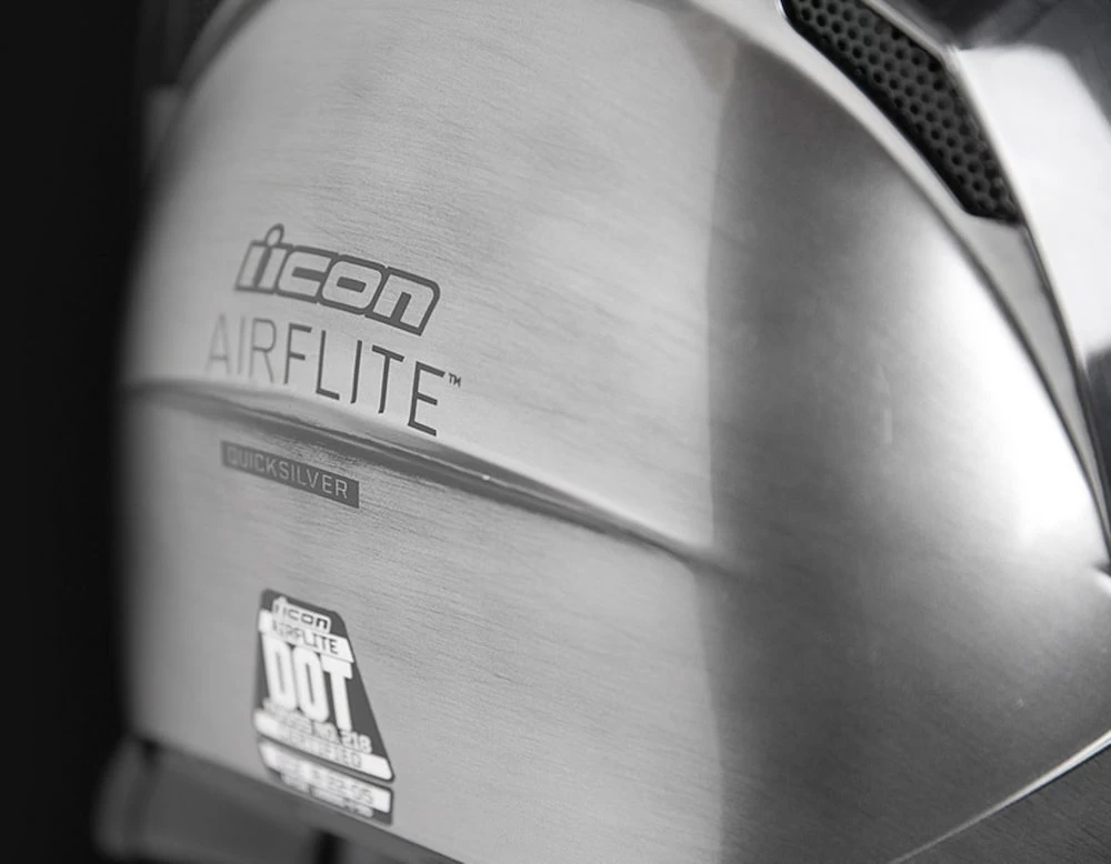 The injection-molded polycarbonate PC-ABS shell of the ICONยฎ Airflite Quicksilver helmet is manufactured under the most stringent quality control standards available on the market today. The dual-density Expanded-Polystyrene liners are engineered to offer maximum impact. Equipped with a clear ICONยฎFliteShieldโข, providing you with a clear and distortion-free line of sight.ย Instead of carrying extra FliteShield for changing light conditions, with the flip of a switch, engage the tinted DropShield hidden within the helmet.