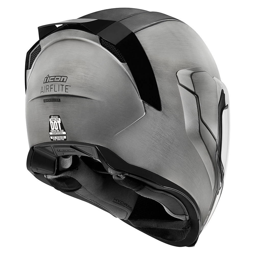 The helmetโs ventilation system consists of strategically placed air vents, intakes, air channels and exhaust ports. The oversized chinbar intake enhances airflow, keeping you cool by routing air where you need it most. A decrease of both drag and weight was achieved by sculpting the traditional neckline of the Airflite Quicksilver to avoid jacket or suit interference. The ICONยฎ Airflite Quicksilverโข helmet features a customizable interior lined with Iconโs exclusive moisture wicking material, HydraDry.