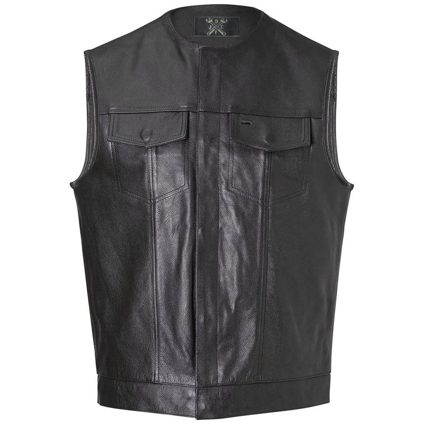 This leather vest with zipper and button closure is made from 1-1.1mm bovine leather with a cotton inner lining for breathability and comfort. On the front two closable pockets and inside facing pockets.