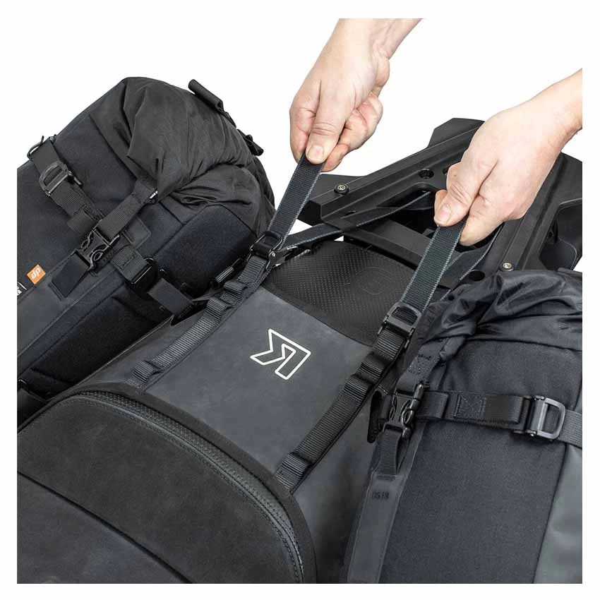 This system provides a super-tough, lightweight carrying solution, with no drilling or permanent bodywork alterations needed. The fitting hardware gives the flexibility to mount a one, two, or three-pack set-up, depending on your ride. The set-length straps make mounting quick and easy, and the custom shape provides a tight, secure fit with plenty of distance from the exhaust. It takes less than a minute to mount and just seconds to remove it.