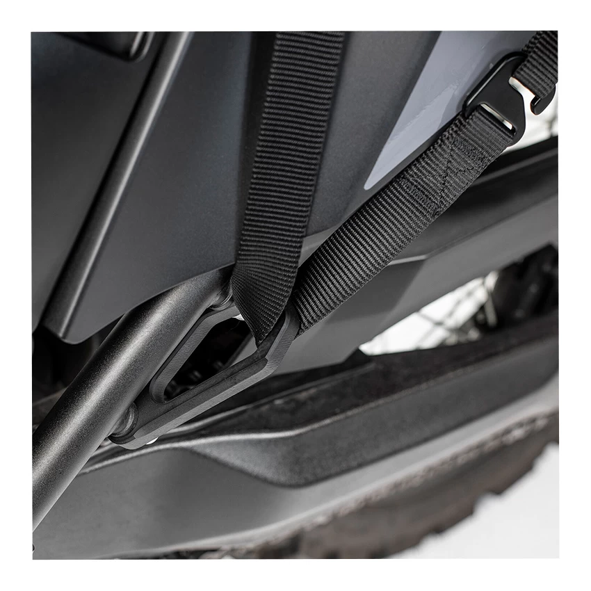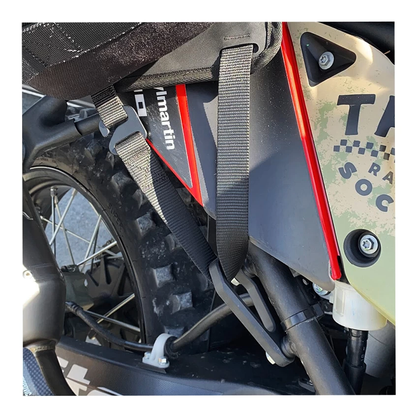 Provides an alternative mounting location for the front straps on an OS-BASE Yamaha Tenere 700 when the rear footrests are removed. Available in two options for bikes with a Standard Seat or a Rally Seat.