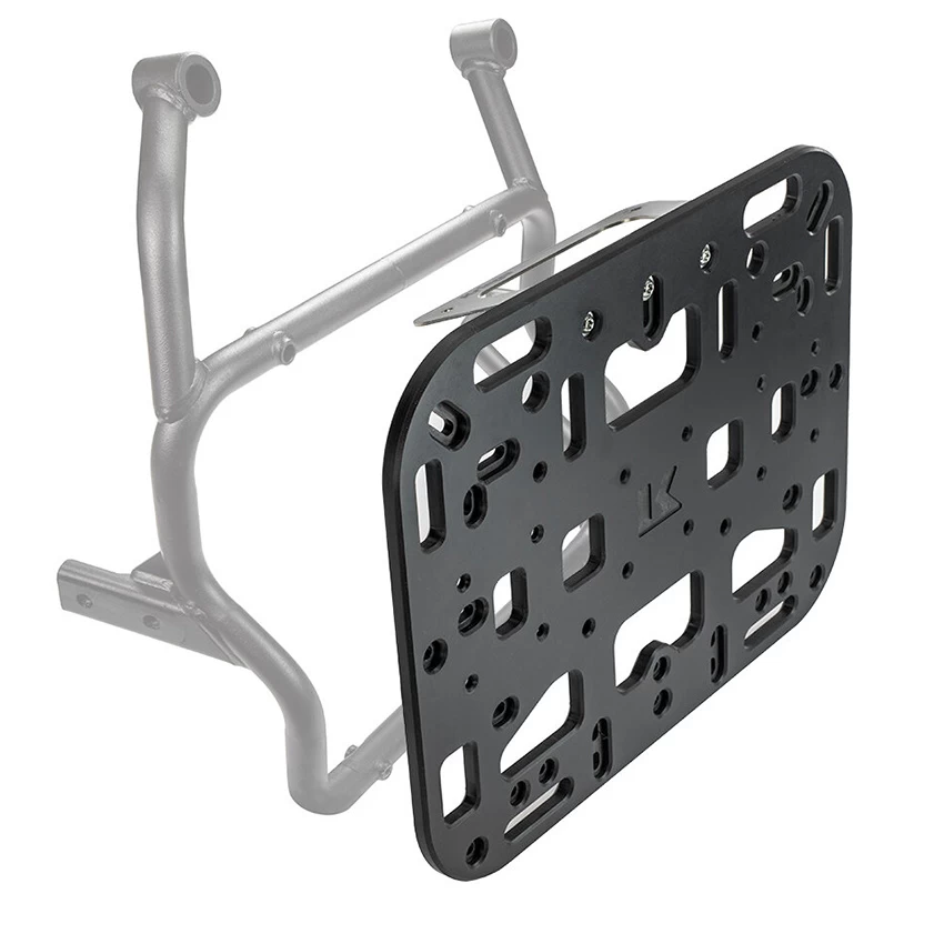 YAMAHA/GIVI pannier frames are designed to mount aluminium cases and do not have a standard flat profile on the exhaust side. This special edition OS-PLATFORM includes a stainless steel adaptor to flatten the profile and provide a strong mounting location for the OS-PLATFORM, which then gives you the option to mount Kriega ‘Soft Luggage’.