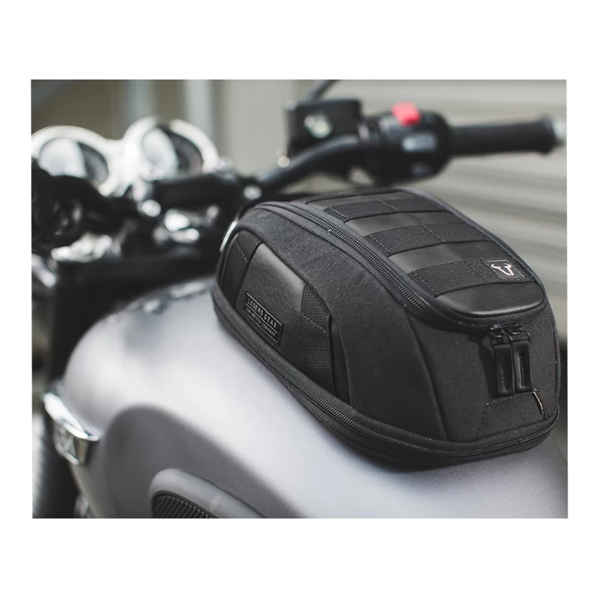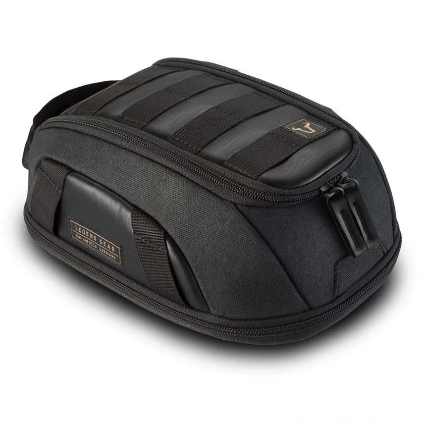 The Legend Gear LT1 tank bag is securely attached by magnets. The bag is equipped with padding on the bottom to prevent scratches on the tank, has a compact design and can be mounted on almost any metal tank.
