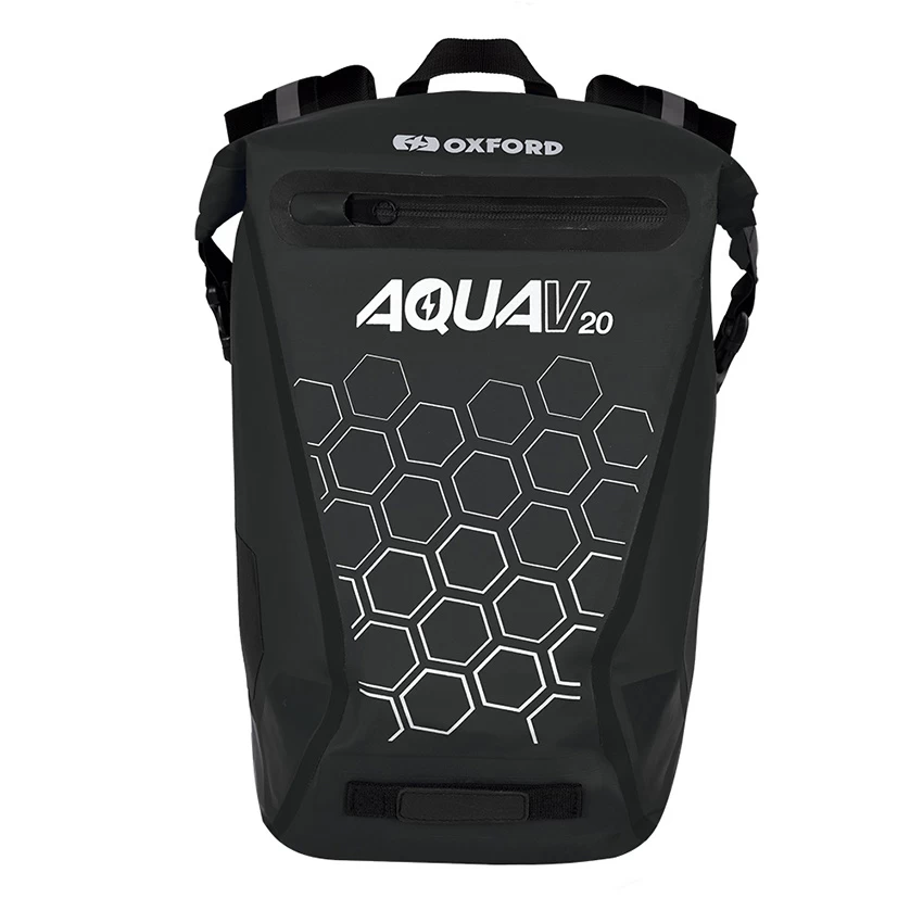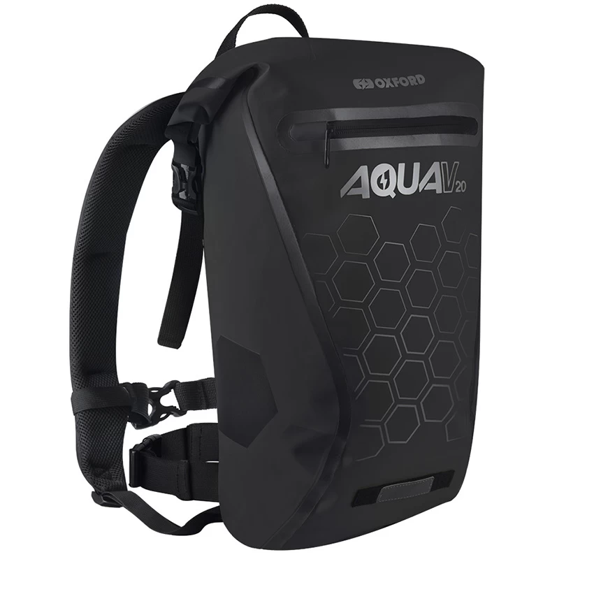 Oxford Aqua V20 backpacks are made from a tough PVC tarpaulin, which is welded to form waterproof seams. When straps are added to perform essential functions (such as securing the bag onto a motorcycle), Oxford uses innovative construction techniques to further reinforce the bag whilst ensuring complete waterproofing.
