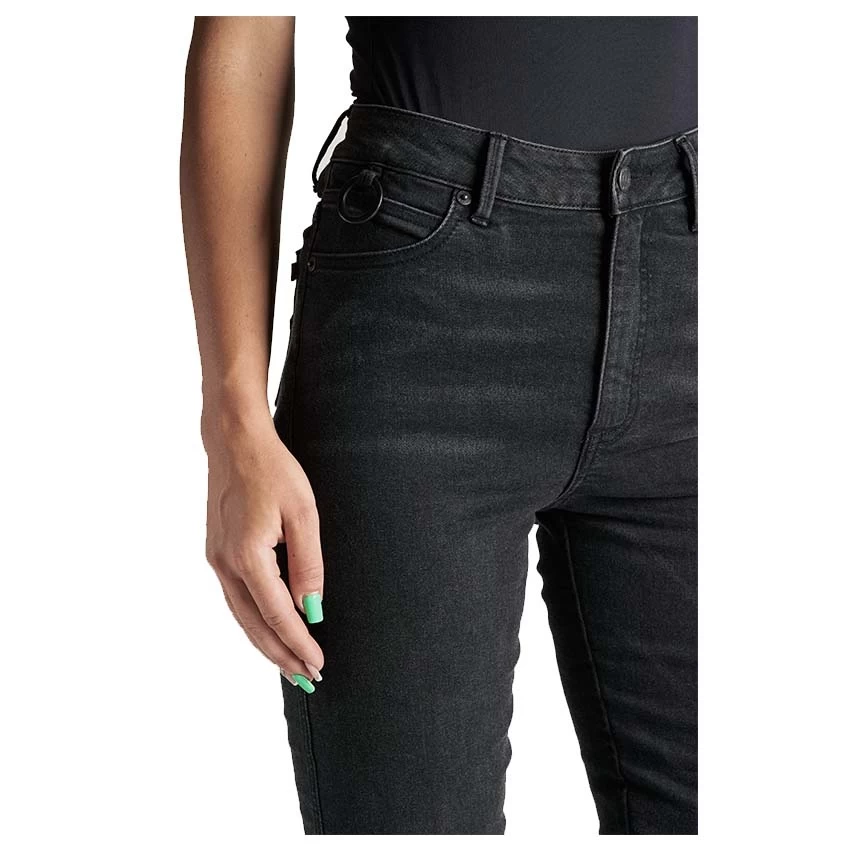 Pando Moto ladies motorcycle jeans made of abrasion resistant Cordura denim combined with Coolmax technology. The Kusari Cor has a skinny fit and a high waist for extra comfort both on and off the bike. Standard equipped with level 1 protectors on the knees and prepared for possible hip protection. The jeans are reinforced with chain stitches at critical points and the knee protectors can be adjusted in two positions, so that the protectors are always in the right place.