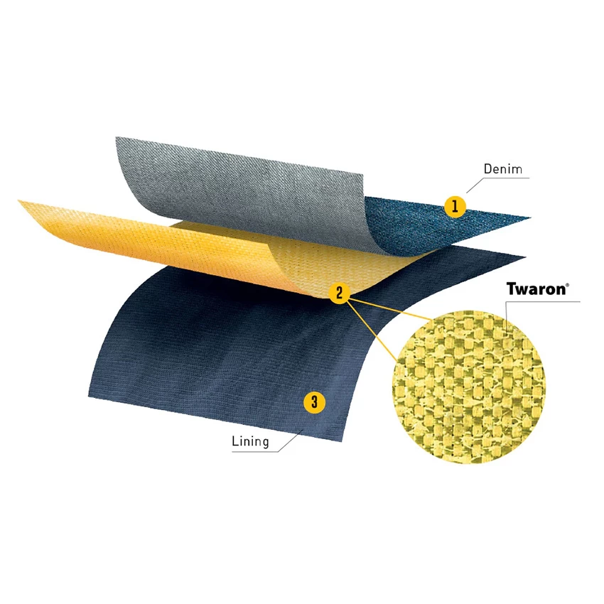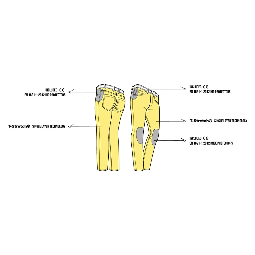 The PMJ Street is an abrasion-resistant motorcycle jean with protectors on the knees and optionally on the hips. Slim fit and a great stonewash look. Great in detail, appearance and comfort. Made of Stretch Twaronยฎ, an innovative fiber with very high protection. Guarantees high resistance to heat, to cutting, no melting point and very low flammability.