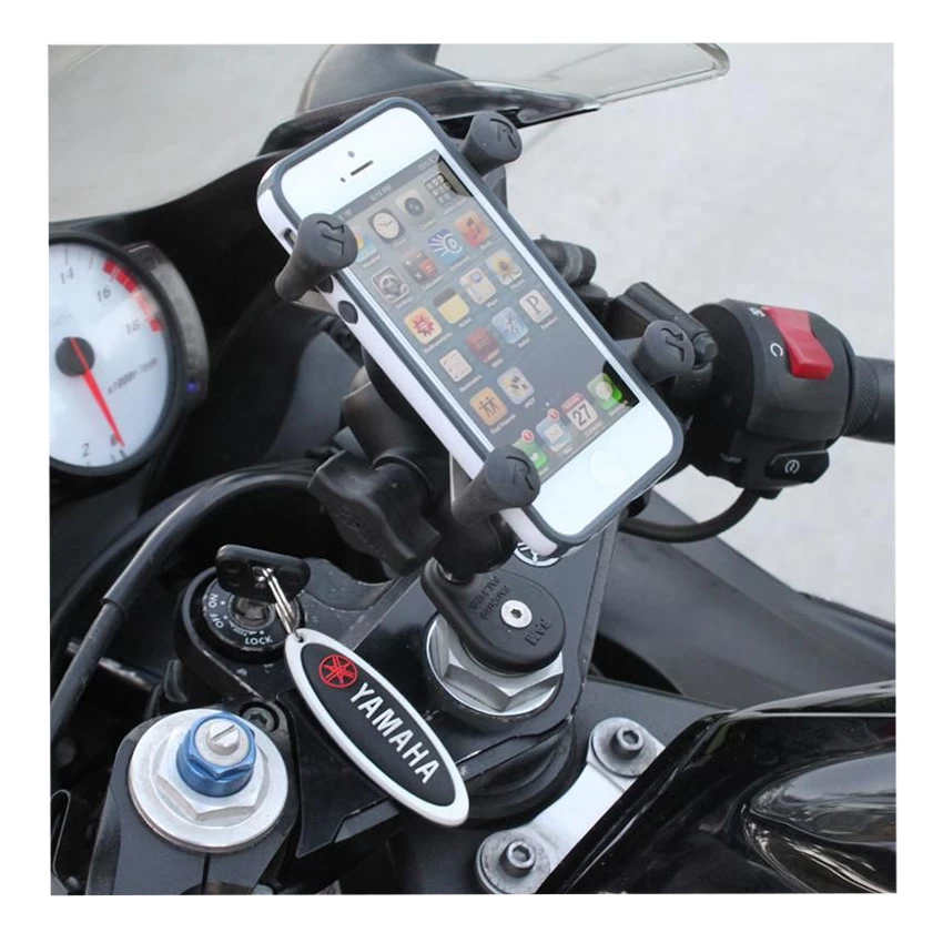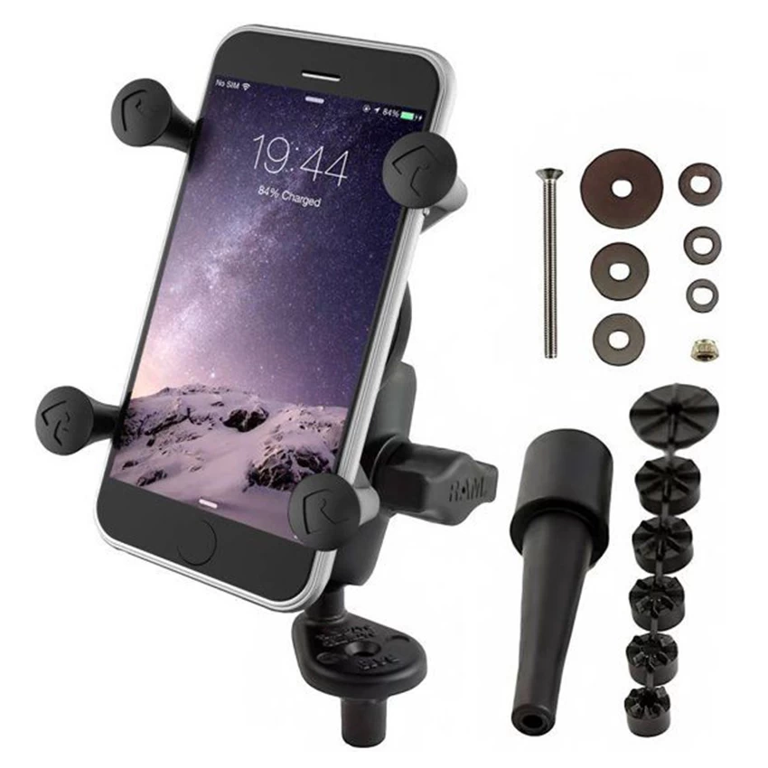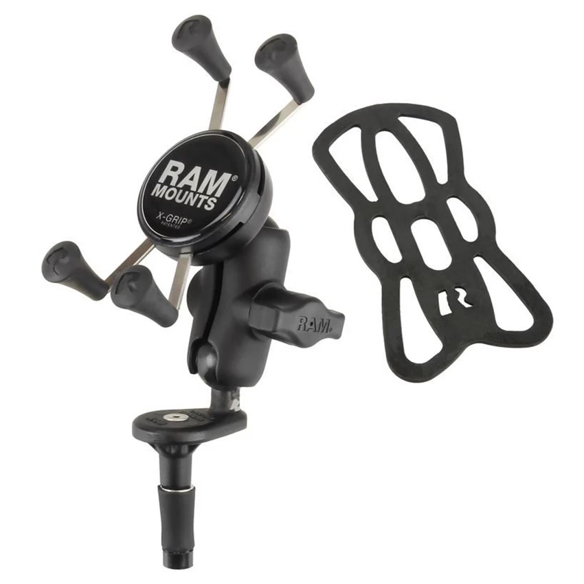 The RAM-Mount kit fork stem consists of a fork stem base, short double socket arm and universal X-Grip® cradle. The included X-Grip® cradle has a clean and clever four leg design that sports great holding power without hiding your phone behind foam pads and plastic. The spring-loaded X-Grip® cradle expands and contracts, allowing for a perfect custom fit of your cell phone.