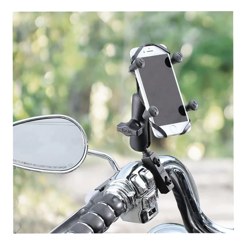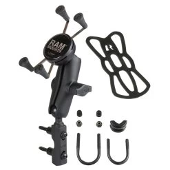 The Universal X-Grip Holder With U-Bolt Mount consists of a double socket arm, hardware for mounting to both brake/clutch reservoirs and rails that are 0.5″ / 1.2cm to 1.25″ / 3.1cm in diameter, and the Universal X-Grip cell phone holder.