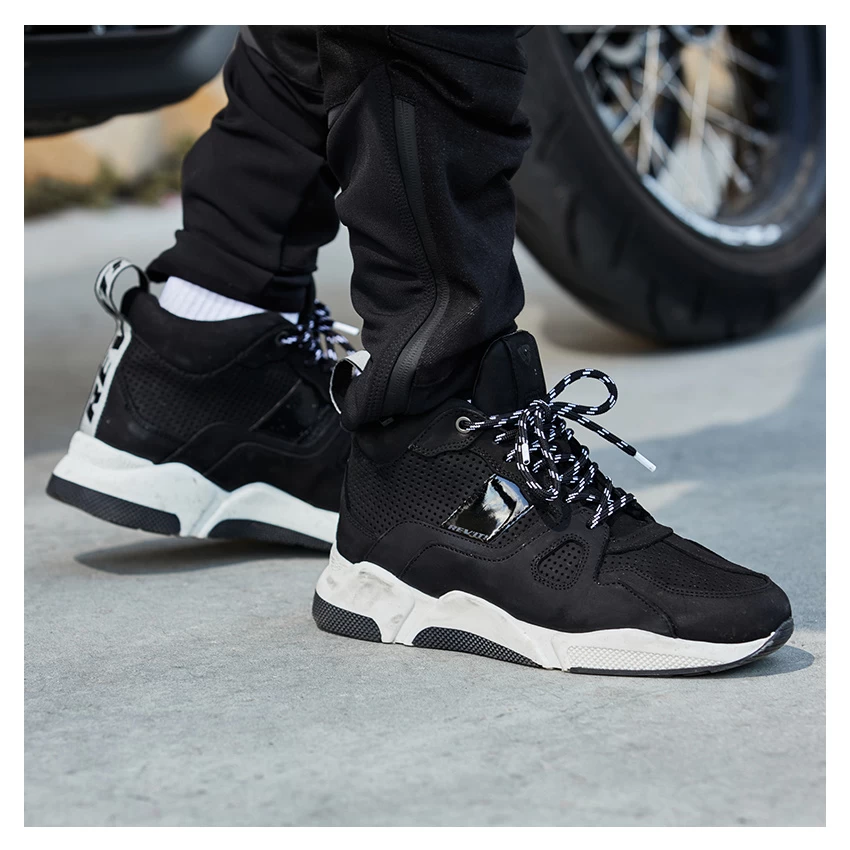 The Rev’it! Astro Ghost are for those who like to wear casual and sport-inspired motorcycle shoes when not riding. These aren’t your average sneakers, but in a way, look like they are. With this pair of footwear, Revit blends trail running, street style, and basketball influences with motorcycle protection. They walk and feel like your everyday kicks. These shoes are offered in black with a white sole and have a full nubuck leather upper, including the toe and tongue area. Along with Nubuck Leather panels, this comprises the exterior of the Astro Ghost. Inside, a leather lining not only adds comfort but naturally helps with wicking moisture. In terms of safety, Revit equipped these haute sneakers with reinforcements at the ankles, heels, and toes, along with thermoformed heel cups and toe caps. A leather shift pad is also incorporated. Furthermore, the OrthoLite® insole gives wearers that extra bit of pillowy softness while on foot.