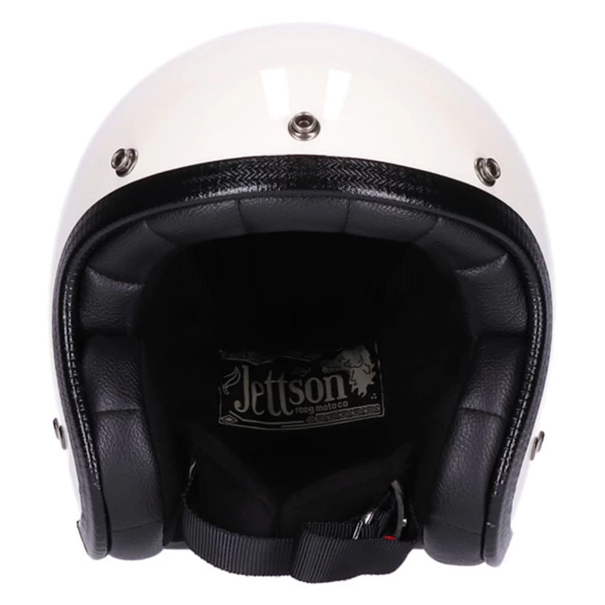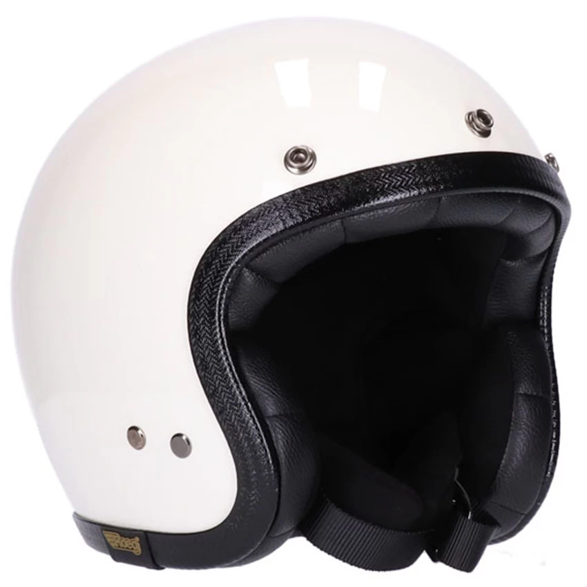 Featuring a classic Double D-ring adjustable chinstrap with Microtechnology fleece padding and premium brass integrated visor/shield snaps. Microtechnology fleece comfort lining with premium synthetic leather detailing for more comfort and classy touch. The Jettson 2.0 helmet vintage white is ECE 22.05 approved and is delivered including a removable black peak.