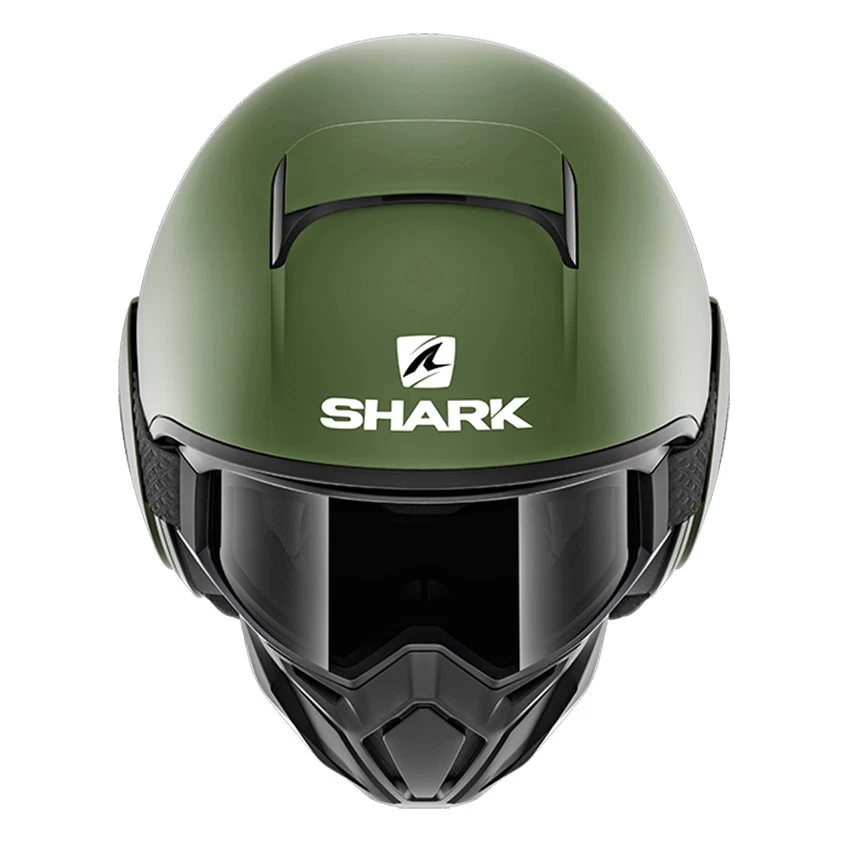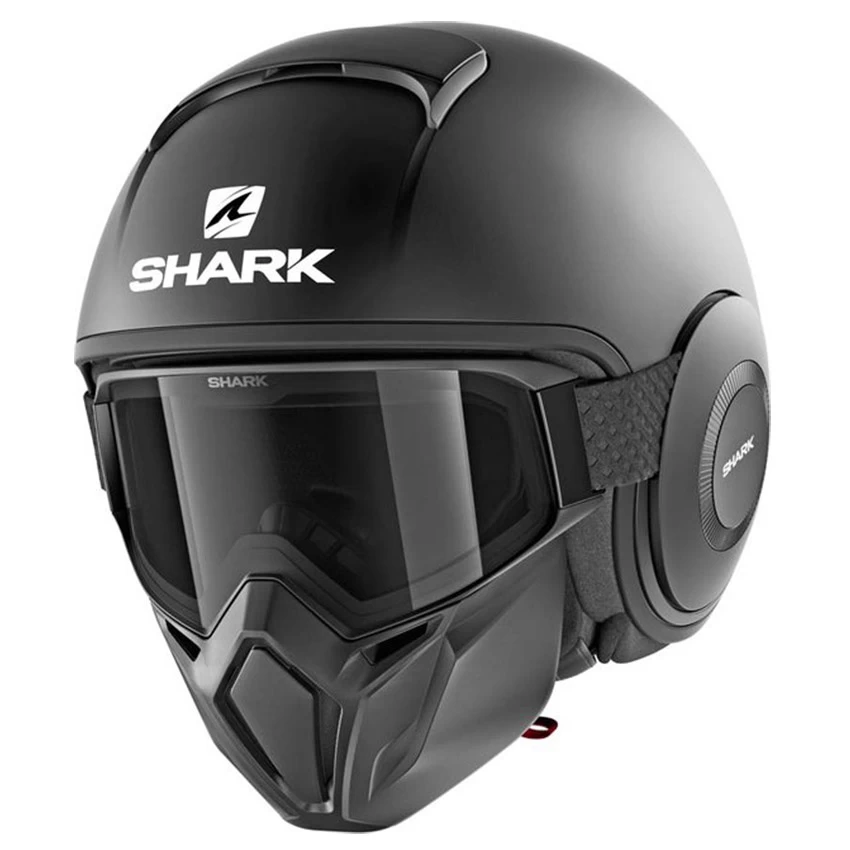 For a helmet with a distinct style, choose the Shark Street DRAK. The Street DRAK is the successor to the popular Shark RAW and features a stronger elastic band made of stiffer material. This motorcycle helmet is based on a jet helmet and equipped with a mouth cap and goggles. Both the mouth cap and goggles can be removed at warmer temperatures. For the wearing comfort of spectacle wearers, there is a recess in the padding at the height of the sleep.